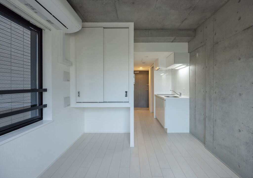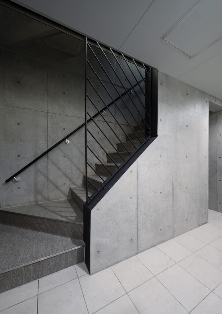 外観の印象を決定づける要素の一つであるバルコニーには、デザイン性と機能性の両立を追求し、シャープなラインを生かした手摺デザインと、打放しコンクリートとの調和を意識した素材選定により、建物全体の統一感をもたらしています。