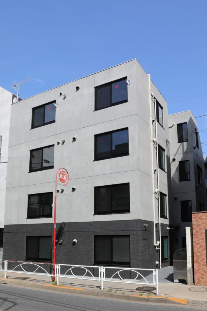 コンクリート打放し仕上げによる重厚感ある外観が印象的な、都市型の賃貸共同住宅です。外壁は下層部にダークトーンのタイルを採用し、全体に落ち着きと高級感を演出。耐久性と防汚性にも優れ、長期にわたり美観を維持します。構造・意匠・設備のバランスを丁寧に計画し、都市部での単身者需要に応える、機能的で快適な住まいを実現しました。