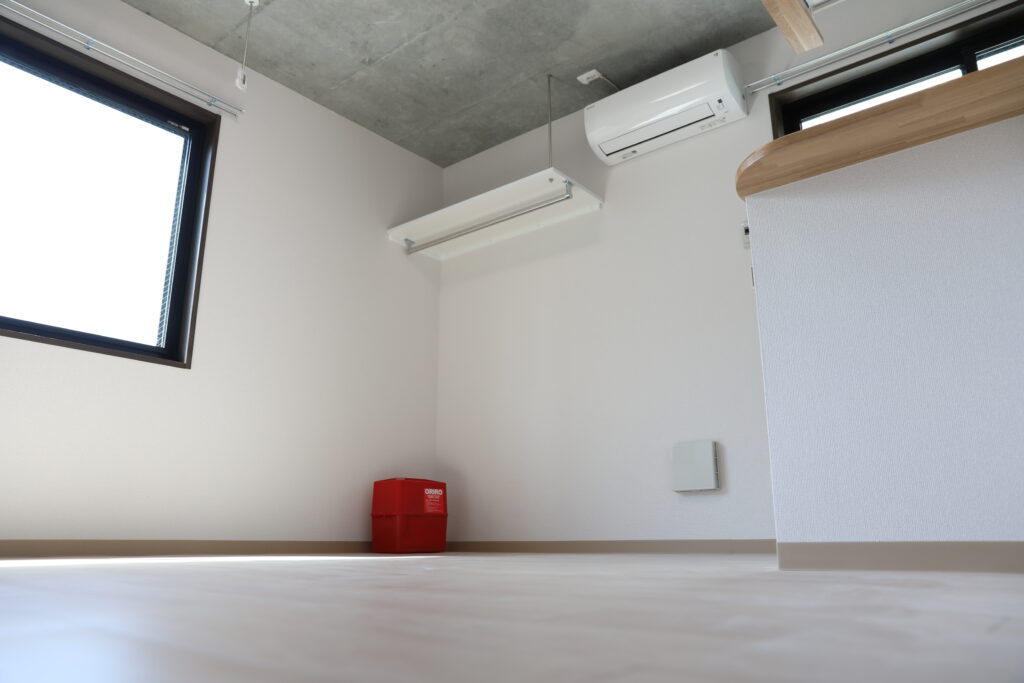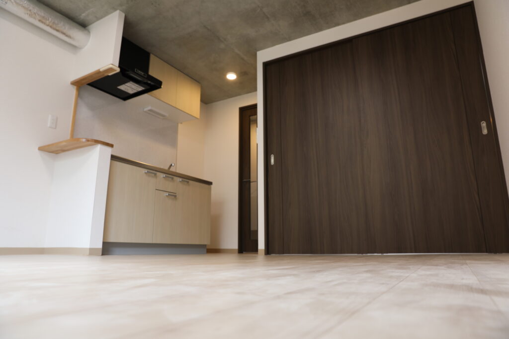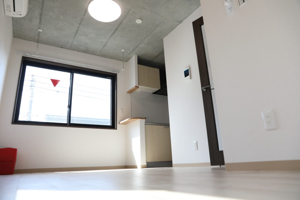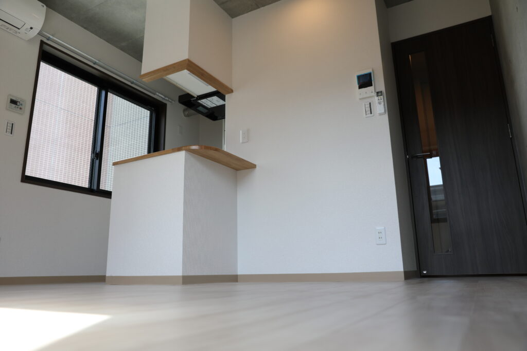 居室内は明るい木目と白を基調としたナチュラルな空間デザインとし、限られたスペースの中でも解放感を感じられるよう設計。キッチンまわりにはカウンターを設け、使い勝手とデザイン性を両立しています。