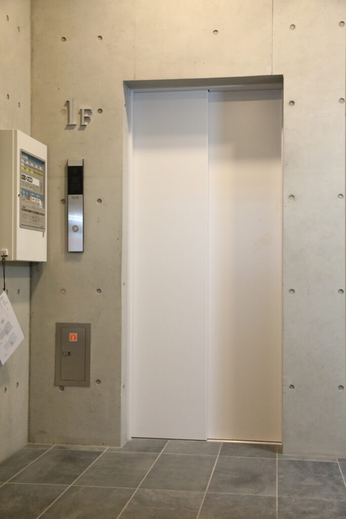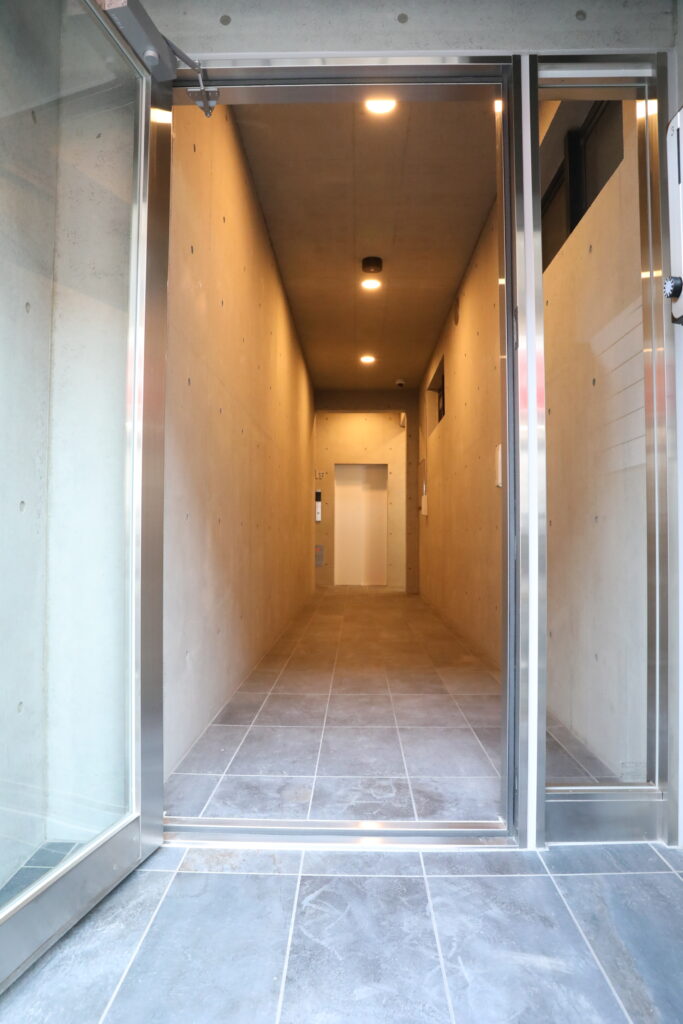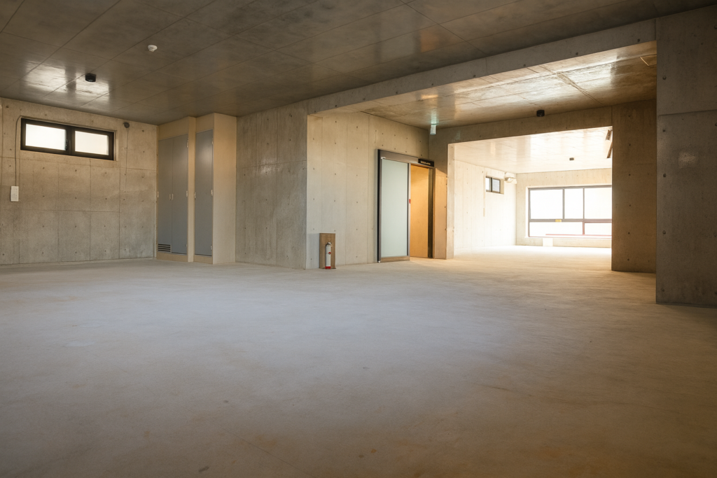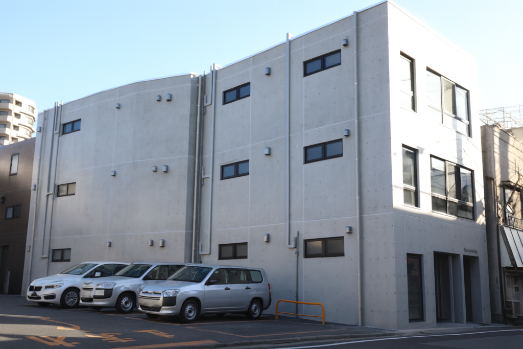 打放しコンクリートの外観が際立つ、シンプルかつ上質なデザインのテナントビルで、明るいエントランスと機能的な動線計画により、来訪者に安心感と洗練された印象を提供します。