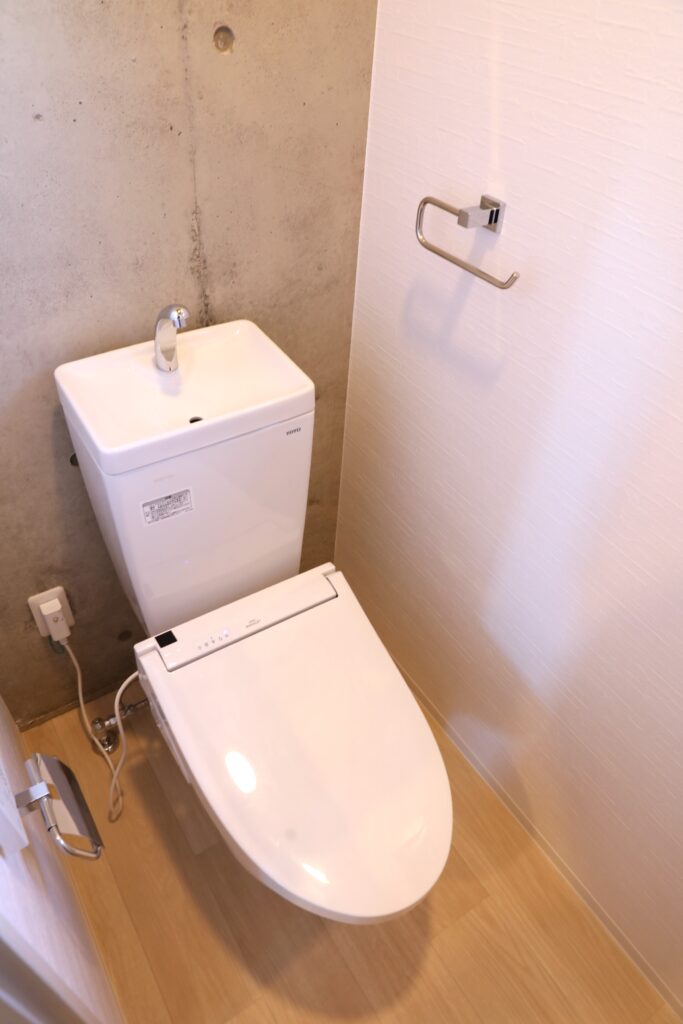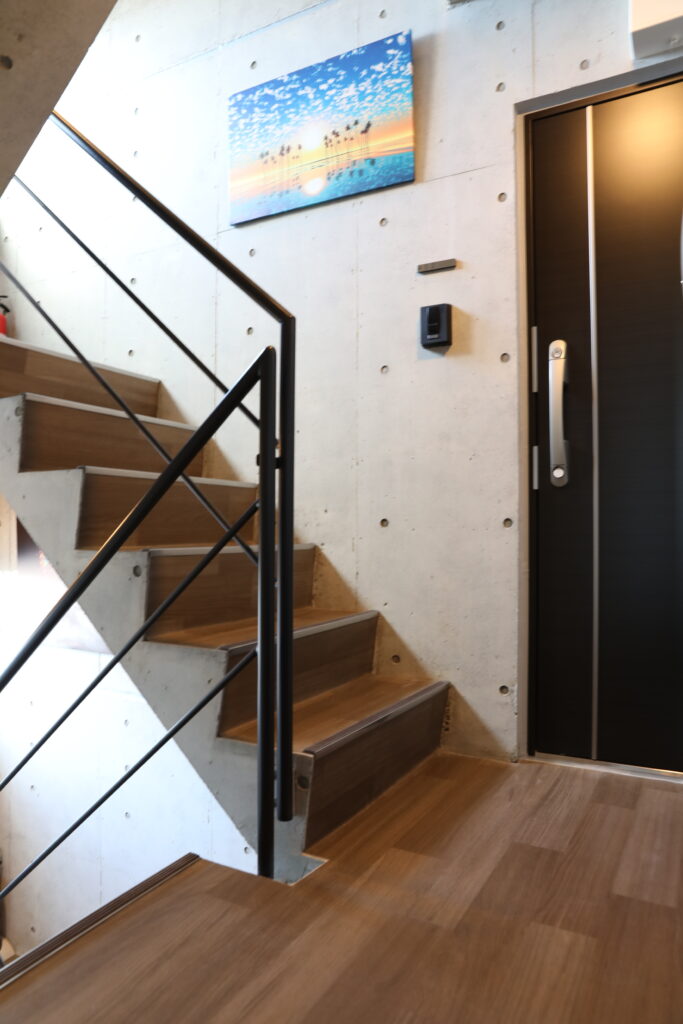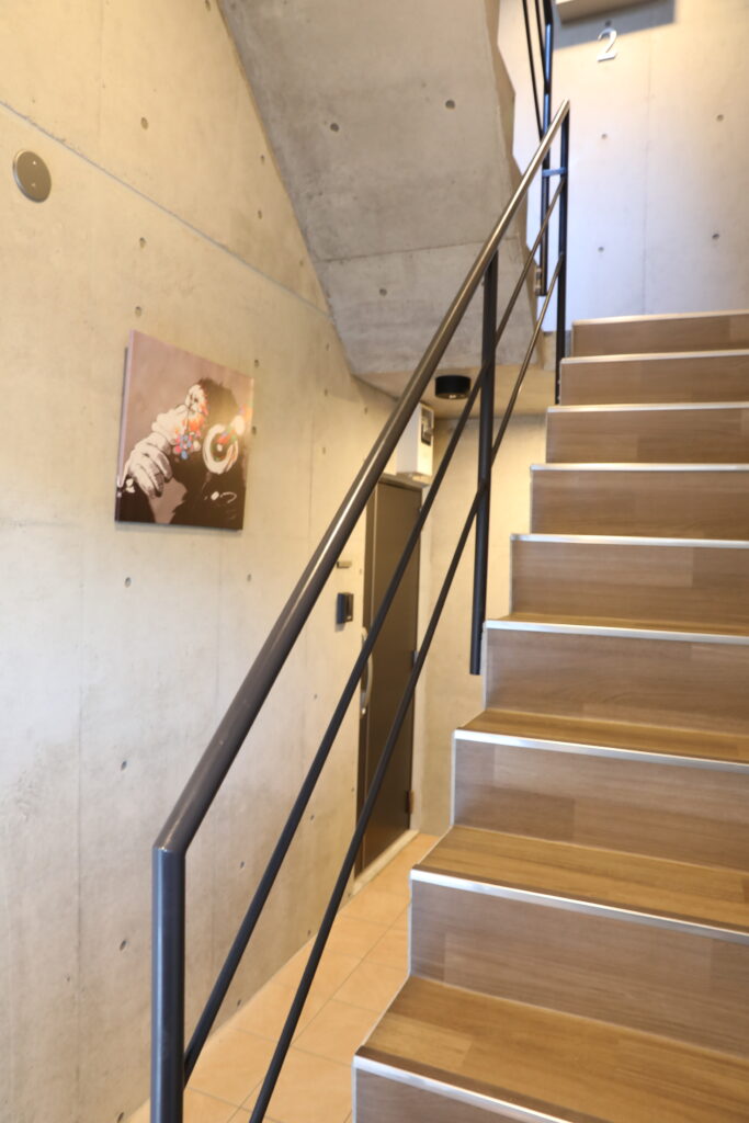 エントランス・共用階段には、コンクリートの質感を活かしたシンプルな意匠を採用し、木調の階段仕上によって温かみがプラスされています。