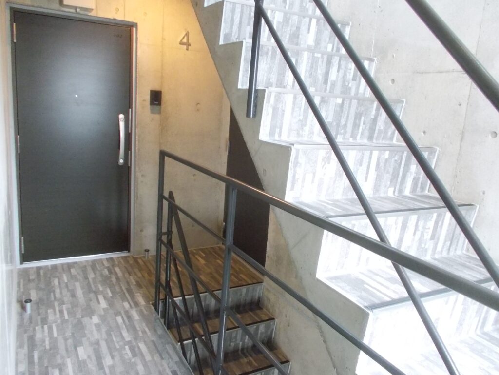 上層階はコンクリート打放し調、下層階は質感豊かなタイル仕上げ。ツートーンで構成された外観は、街並みに溶け込みながらも、確かな存在感を放ちます。