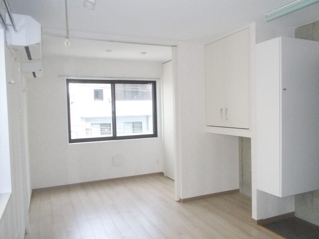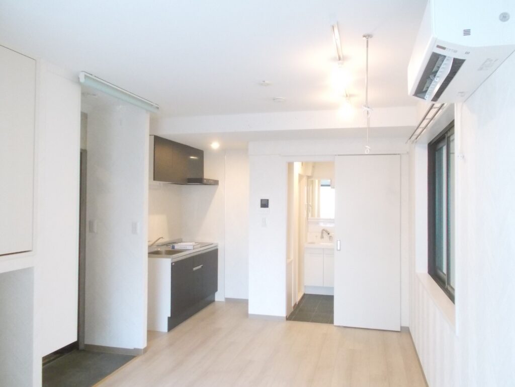スライドドアや効率的な収納配置により、ワンルームながら広さを感じるつくりとなっています。