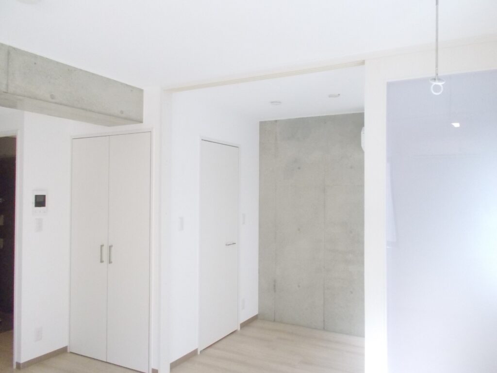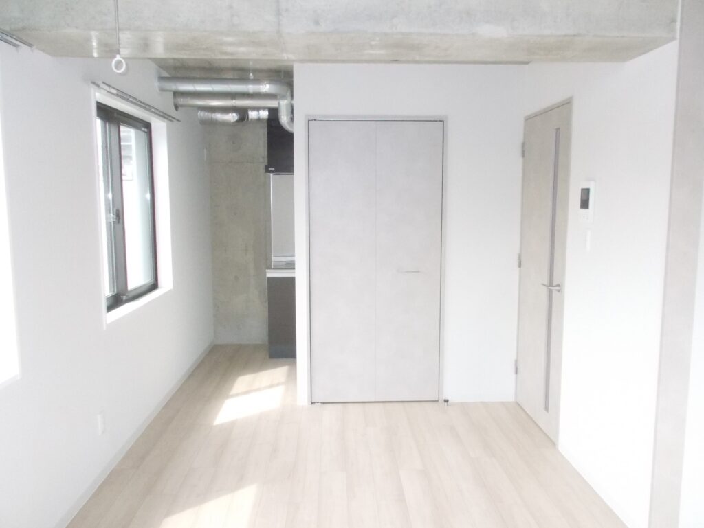 居室は白を基調とした明るい空間に、躯体あらわし天井を組み合わせ、デザイナーズライクな雰囲気を演出。開放感と住み心地の良さを両立しています。